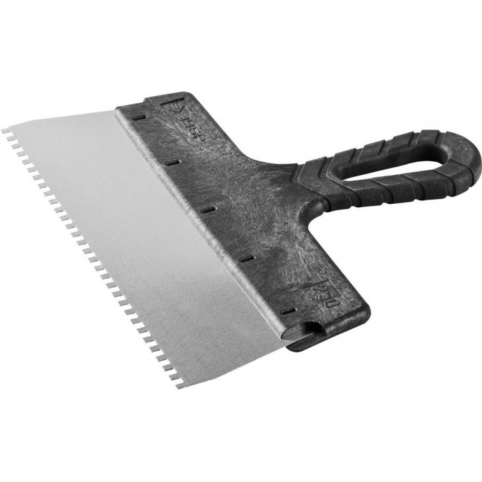 Благодаря зубчатой кромке шпатель идеально подходит для работы со строительными и клеевыми смесями, полотно из нержавеющей стали обеспечивает надежность и долгий срок службы инструмента, а удобная пластмассовая рукоятка создает условия для комфортной работы