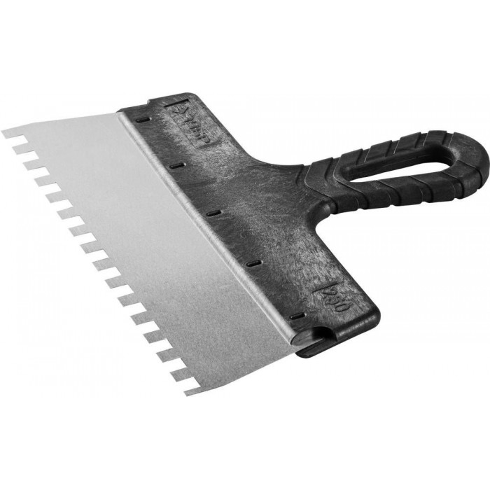Благодаря зубчатой кромке шпатель идеально подходит для работы со строительными и клеевыми смесями, полотно из нержавеющей стали обеспечивает надежность и долгий срок службы инструмента, а удобная пластмассовая рукоятка создает условия для комфортной работы