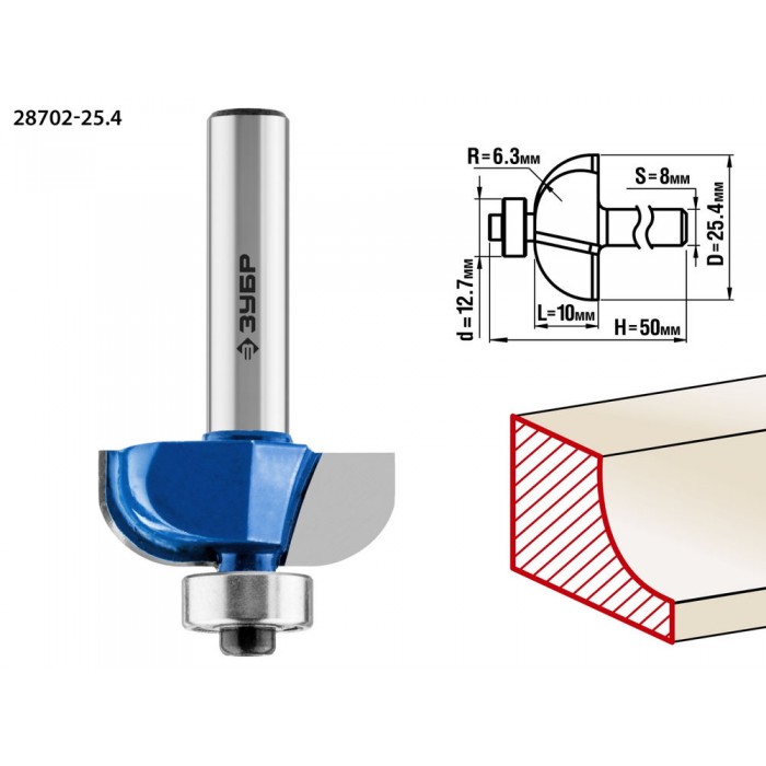 Фреза кромочная калевочная №2 25.4?10 мм радиус 6.3 мм ЗУБР Профессионал 28702-25.4