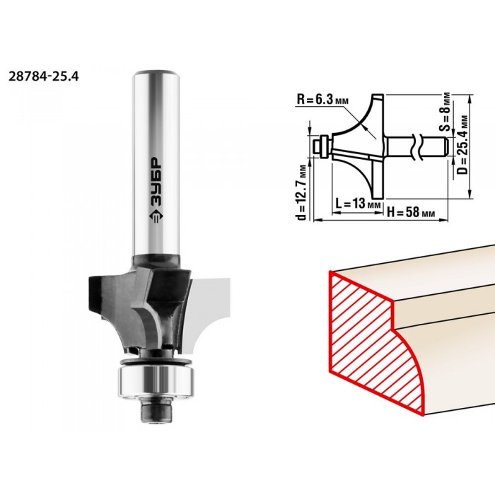 Фреза кромочная калевочная №1 25.4?13 мм радиус 6.3 мм ЗУБР Профессионал 28784-25.4