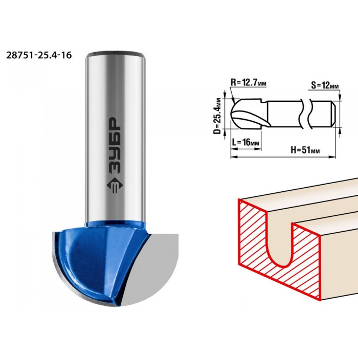 Фреза пазовая галтельная 25.4?16 мм радиус 9.5 мм ЗУБР Профессионал 28751-25.4-16