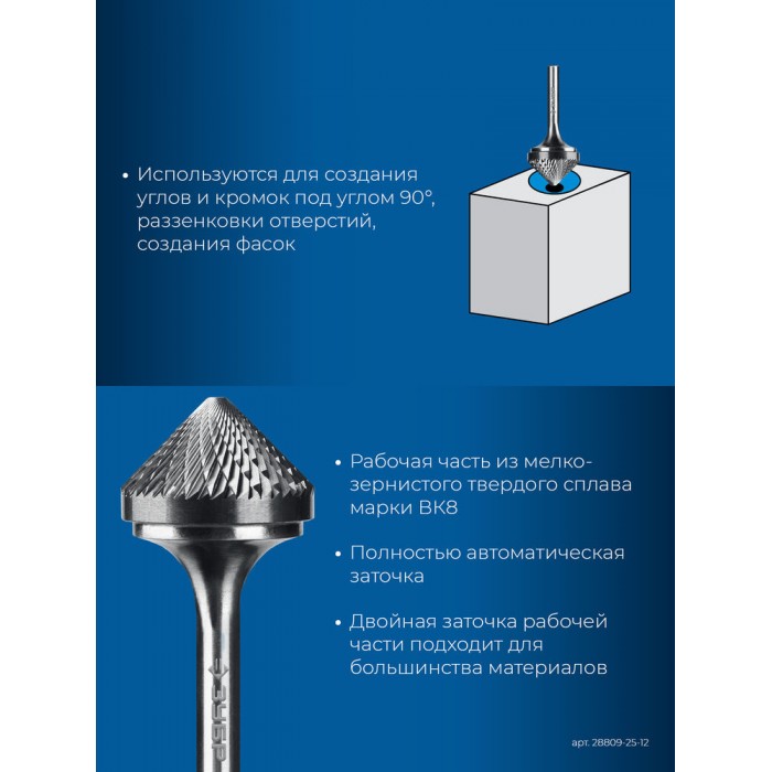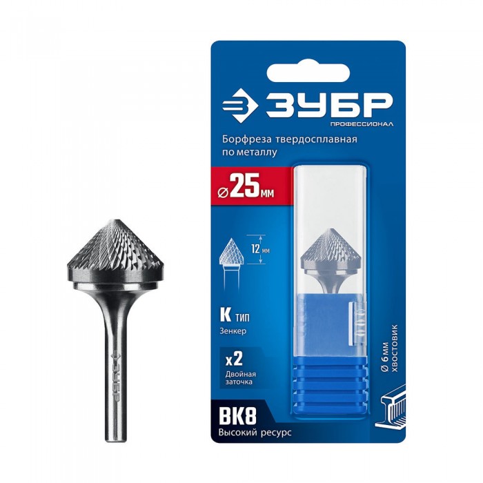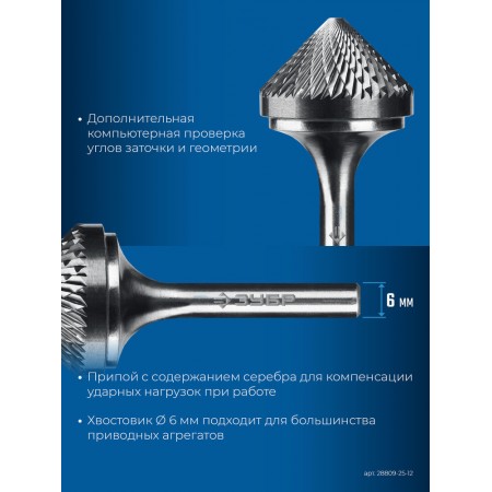 Борфреза твердосплавная 25?12 мм, тип K (зенкер с вершиной 90°), хв-к 6 мм ЗУБР ПРОФЕССИОНАЛ 28809-25-12