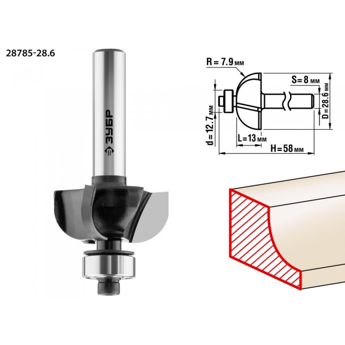 Фреза кромочная калевочная №2 28.6?13 мм радиус 7.9 мм ЗУБР Профессионал 28785-28.6