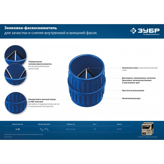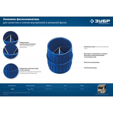Зенковка-фаскосниматель 3–40 мм, для зачистки и снятия внутренней и внешней фасок ЗУБР Профессионал 23791