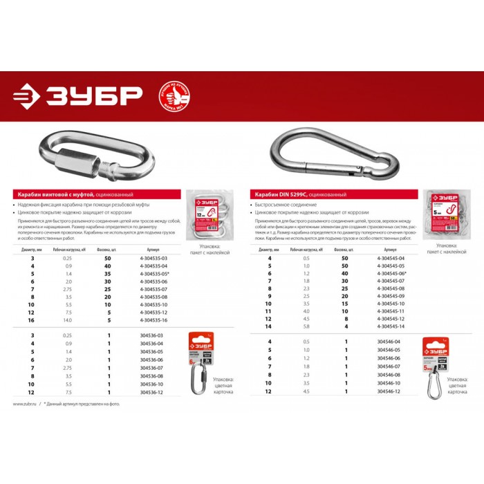 Для быстрого разъемного соединения цепей или тросов между собой, их ремонта и наращивания. Размер карабина определяется по диаметру поперечного сечения проволоки. Карабины не используются для подъема грузов и особо ответственных работ.