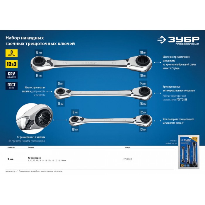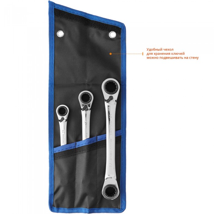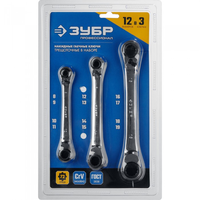 Набор ключей гаечных накидных трещоточных 3 шт Профессионал ЗУБР 27105-H3