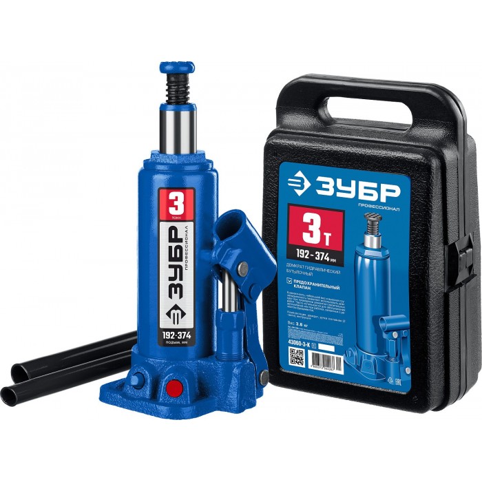 Домкрат гидравлический бутылочный 3 т 194-372 мм в кейсе Профессионал ЗУБР 43060-3-K