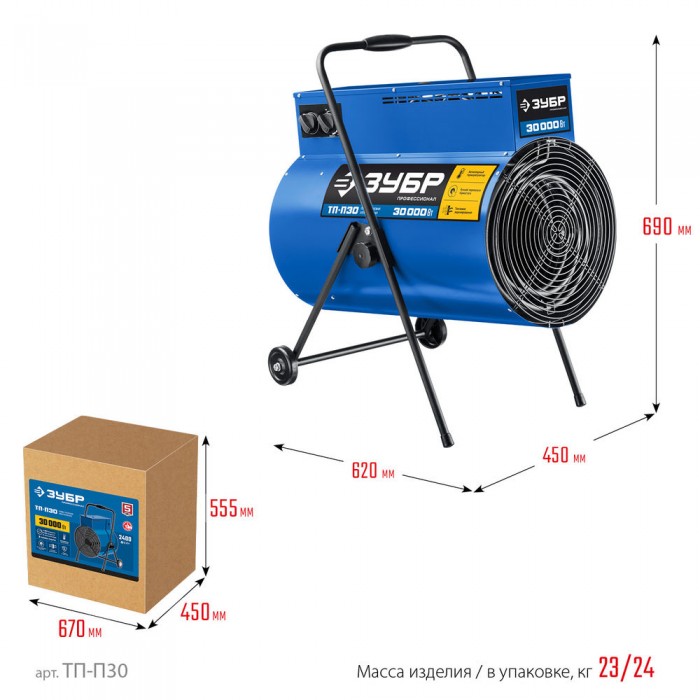 Профессиональные электрические тепловые пушки с питанием от трехфазной электрической сети эффективны для быстрого и направленного обогрева складских и производственных помещений, ангаров и мастерских, благодаря большой площади нагревательных элементов и мощным двигателем вентилятора. Надёжная доработанная конструкци,обеспечивают защиту как пользователя, так и тепловой пушки в случае возникновения нештатных ситуаций. Сделано в России