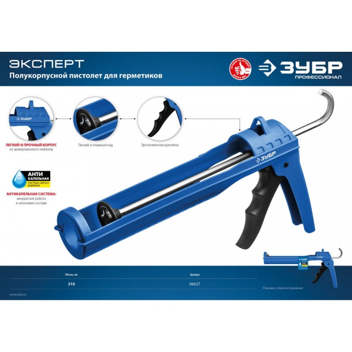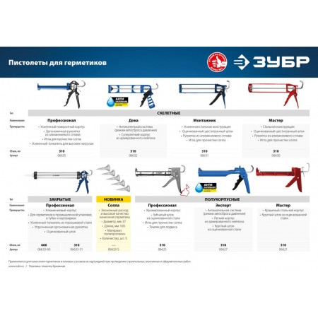 Пистолет для герметиков подходит для работы с картриджами объемом 310 мл, имеет прочный корпус из армированного нейлона, Данная спецификация обеспечивает легкость и надежность конструкции пистолета при использовании.