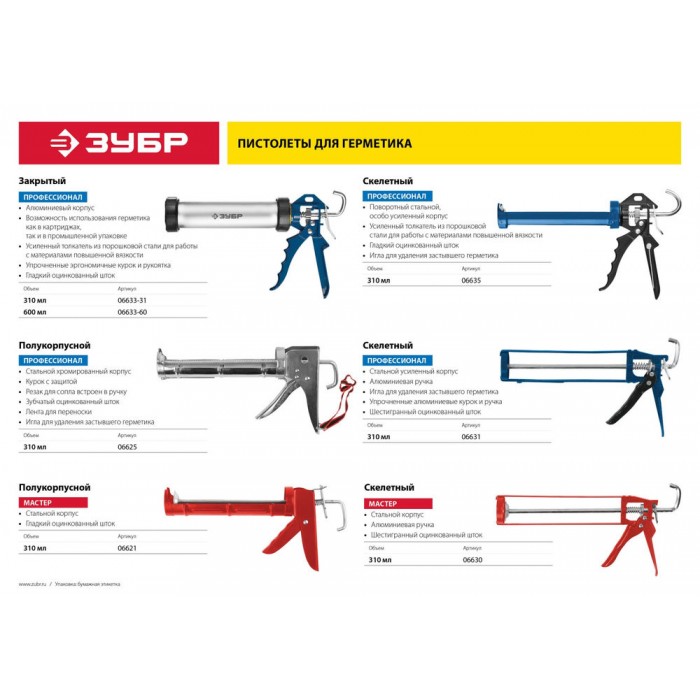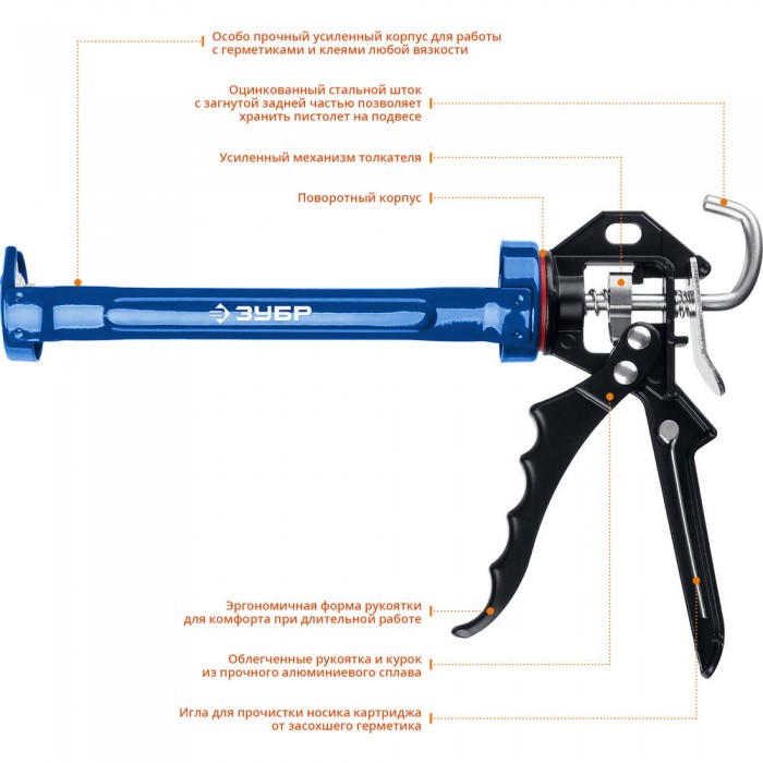 Пистолет для герметиков подходит для работы с картриджами объемом 310 мл, имеет усиленный поворотный корпус, оснащен усиленным толкателем штоком и ручкой из алюминиевого сплава, которые способствуют равномерной подачи клея либо герметика. Данная спецификация обеспечивает прочность и надежность конструкции пистолета при использовании. Оснащен иглой для удаления застывшего герметика/клея.