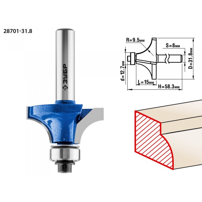Фреза кромочная калевочная №1 31.8?15 мм радиус 9.5 мм ЗУБР Профессионал 28701-31.8