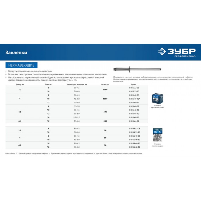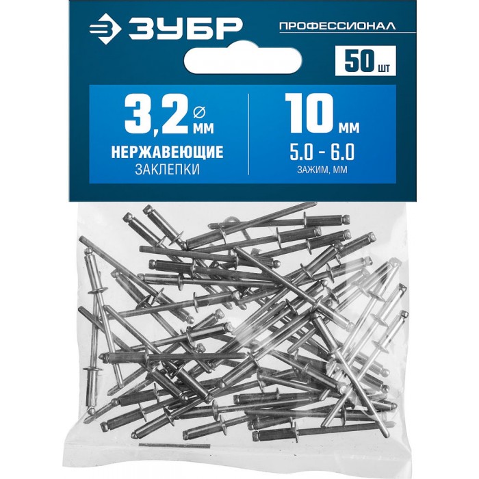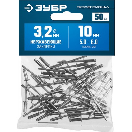Заклёпки нержавеющие 3.2?10 мм 50 шт ЗУБР Профессионал 313166-32-10