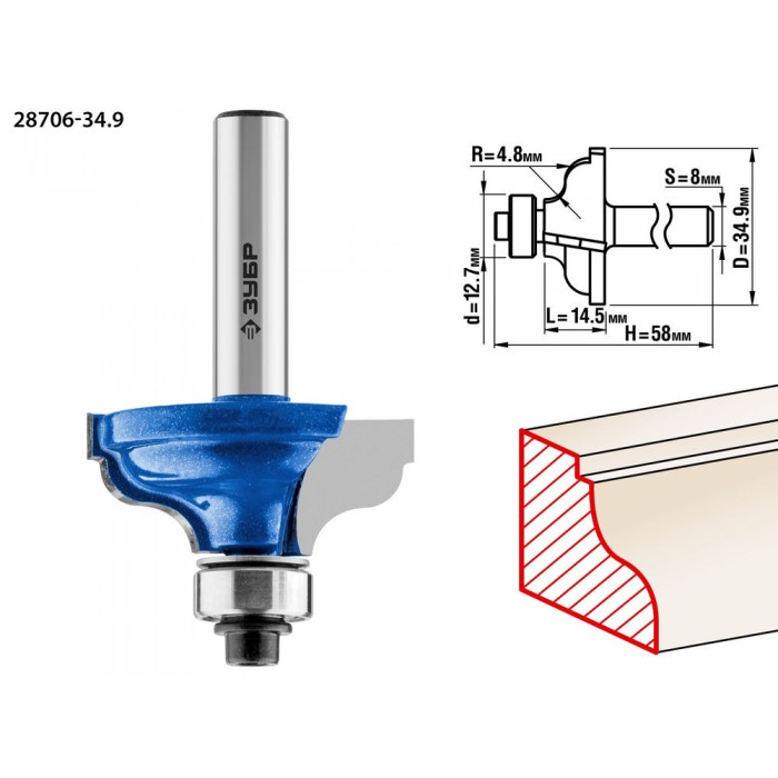 Фреза кромочная калевочная №5 34.9?15 мм радиус 4.8 мм ЗУБР Профессионал 28706-34.9