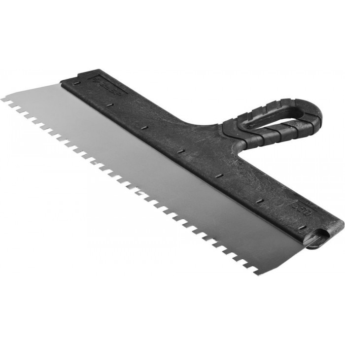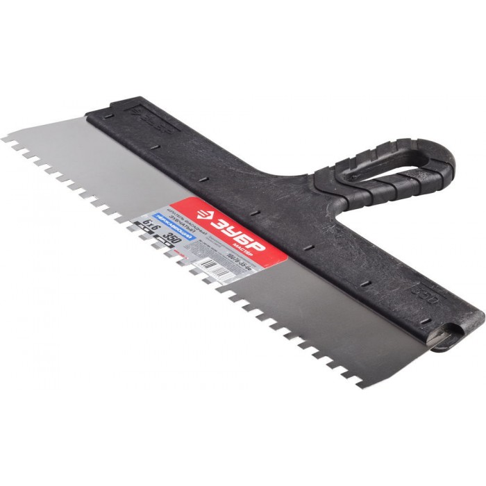 Благодаря зубчатой кромке шпатель идеально подходит для работы со строительными и клеевыми смесями, полотно из нержавеющей стали обеспечивает надежность и долгий срок службы инструмента, а удобная пластмассовая рукоятка создает условия для комфортной работы