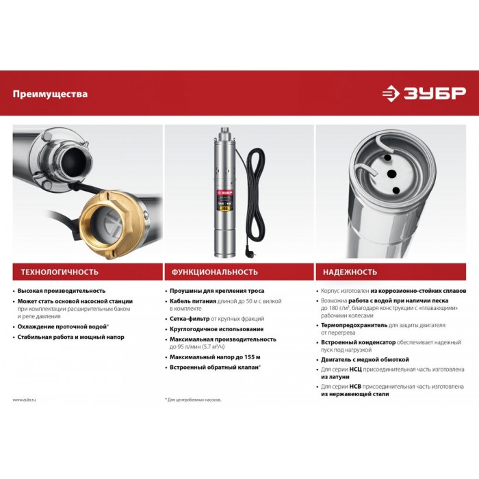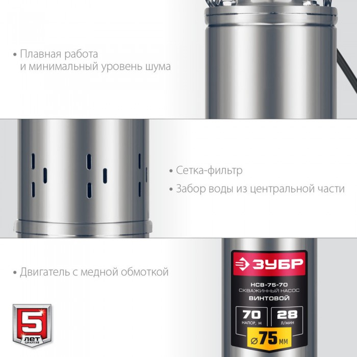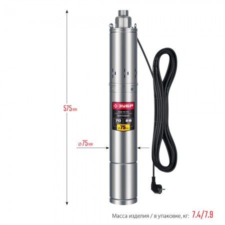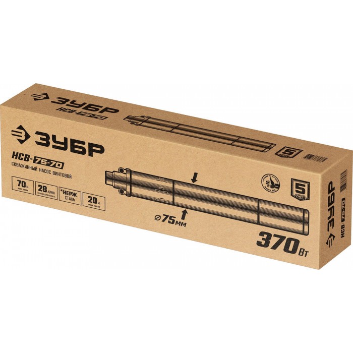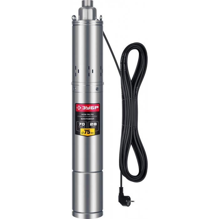 Насос скважинный винтовой 370 Вт, 70 м напор, корпус из нержавеющей стали ЗУБР НСВ-75-70