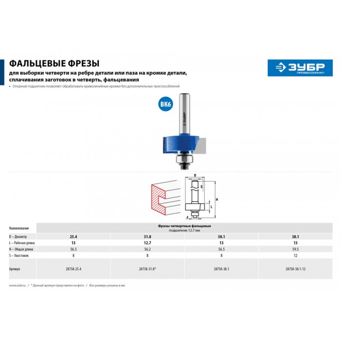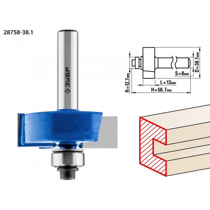 Фреза фальцевая 38.1?13 мм хвостовик 12 мм ЗУБР Профессионал 28758-38.1