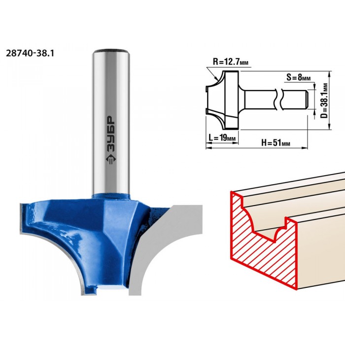 Фреза пазовая фасонная №1 38.1?19 мм радиус 12.7 мм ЗУБР Профессионал 28740-38.1