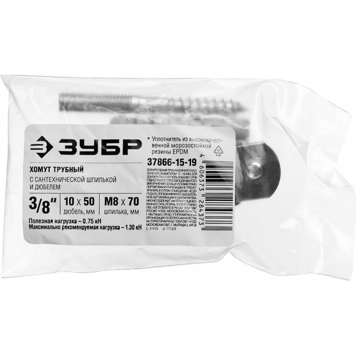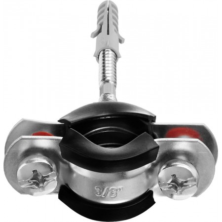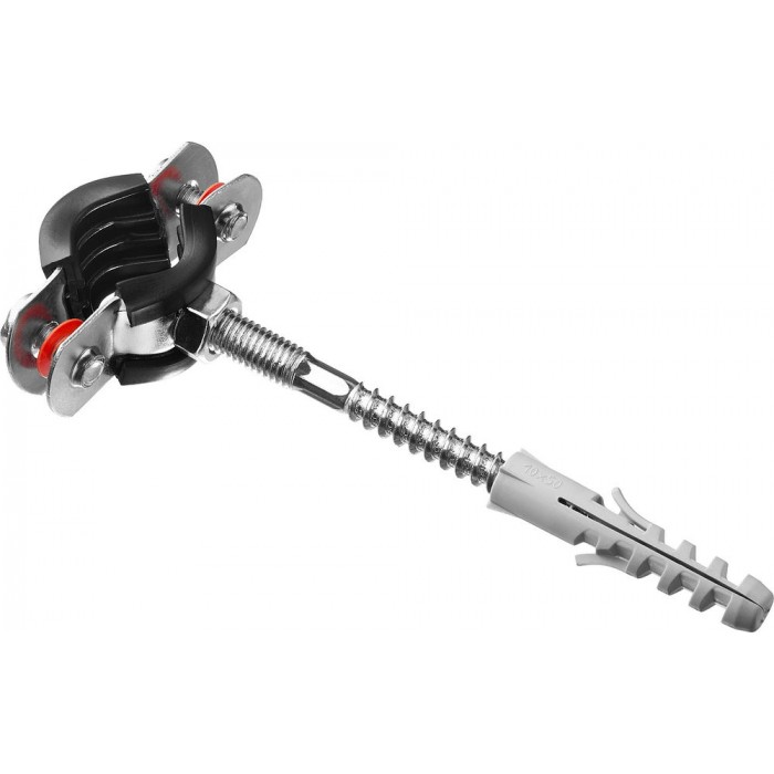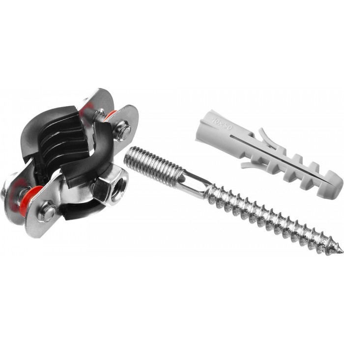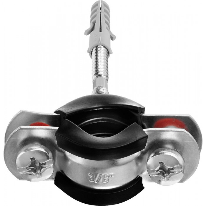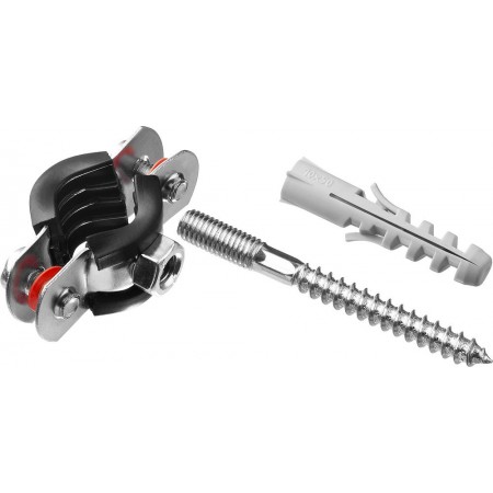 - Комплектность набора позволяет крепить хомут как с помощью гайки, так и с использованием шпильки и дюбеля
