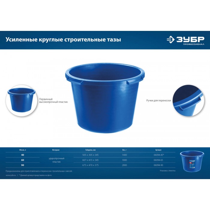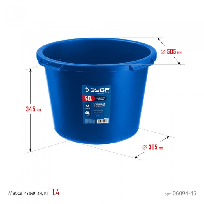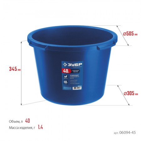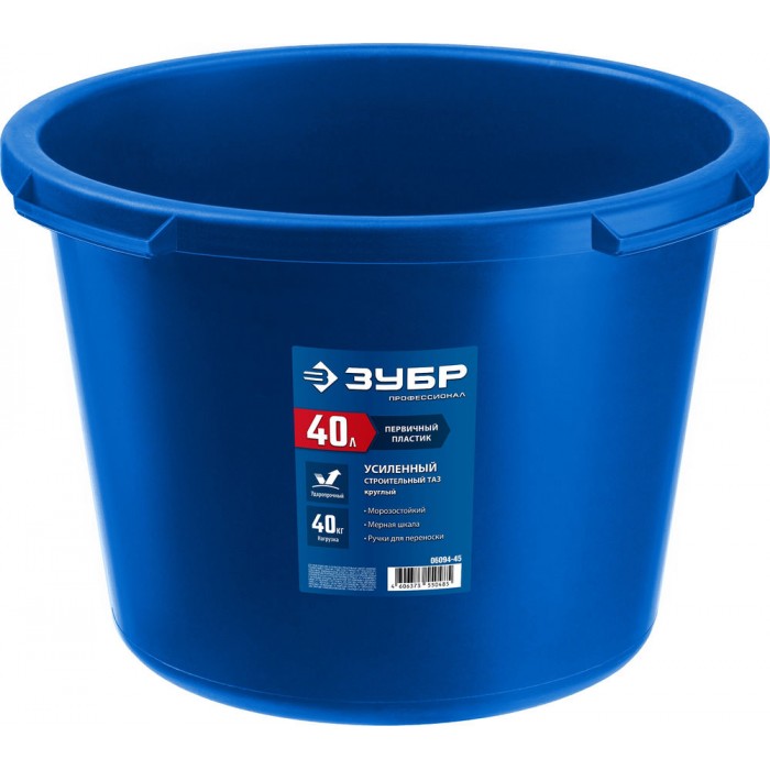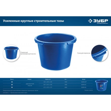 Таз строительный круглый усиленный 40 л, первичный высокопрочный пластик ЗУБР 06094-45