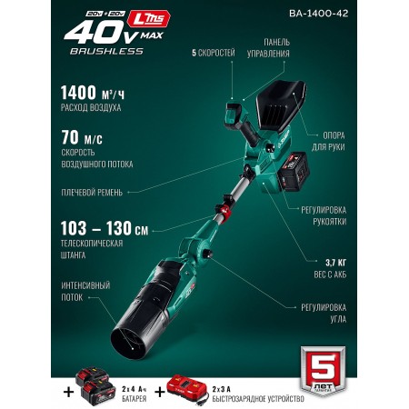 ЗУБР 40 В (2x20В), 1400 м3/ч, 2 АКБ LMS (4 Ач), воздуходувка аккумуляторная (ВА-1400-42)