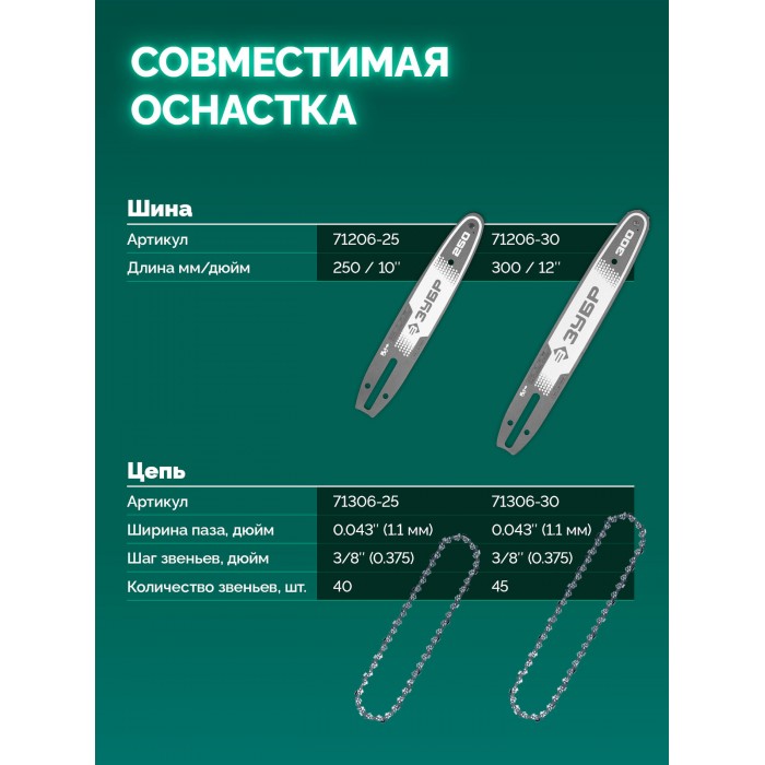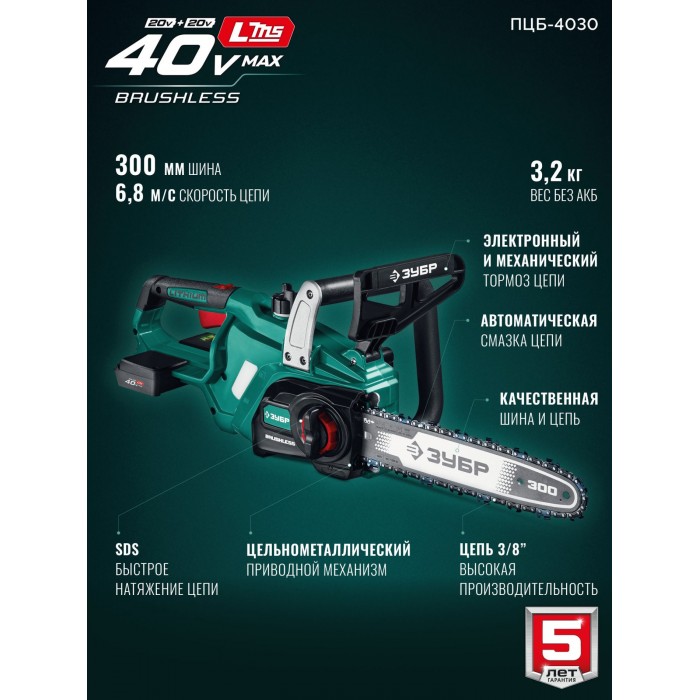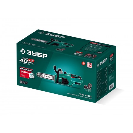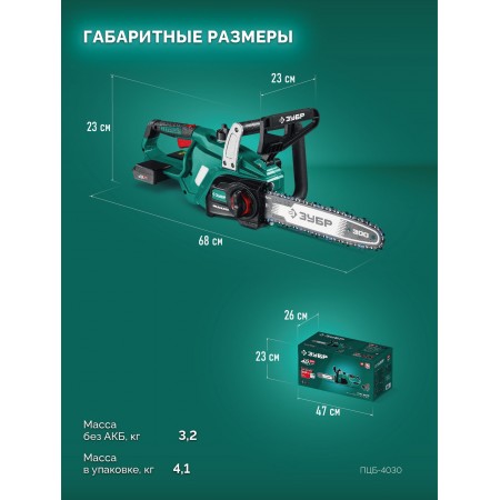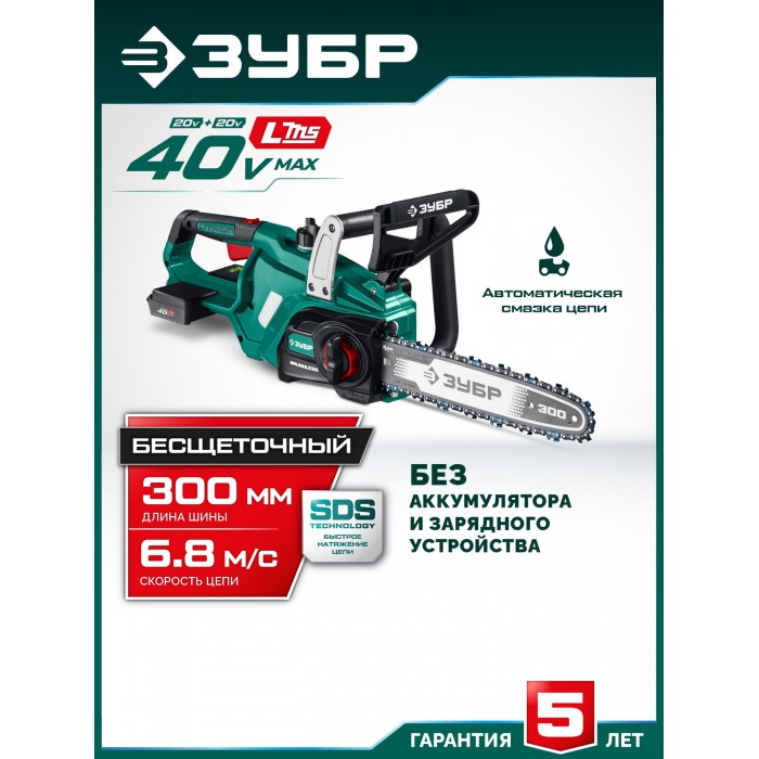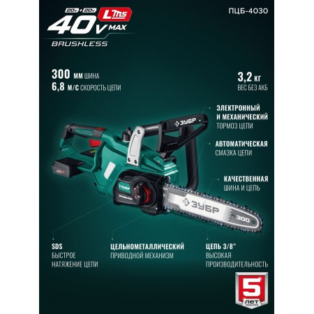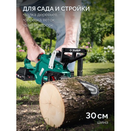 ЗУБР 40 В, (2x20В), 300 мм шина, без АКБ (LMS), пила цепная аккумуляторная (ПЦБ-4030)