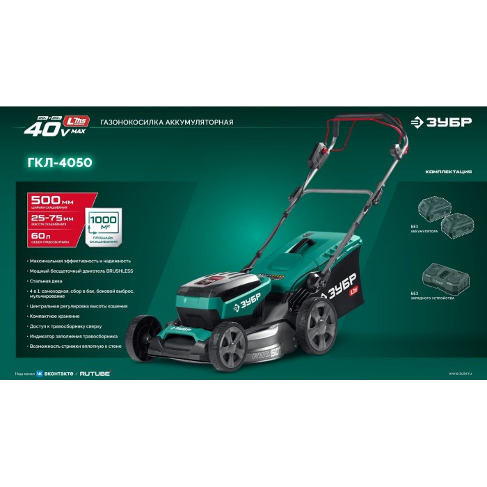 ЗУБР 40 В (2x20В), 500 мм, без АКБ (LMS), самоходная газонокосилка аккумуляторная бесщеточная (ГКЛ-4050)