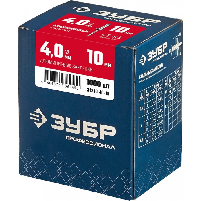 Заклёпки алюминиевые 4.0?10 мм 1000 шт ЗУБР Профессионал 31310-40-10