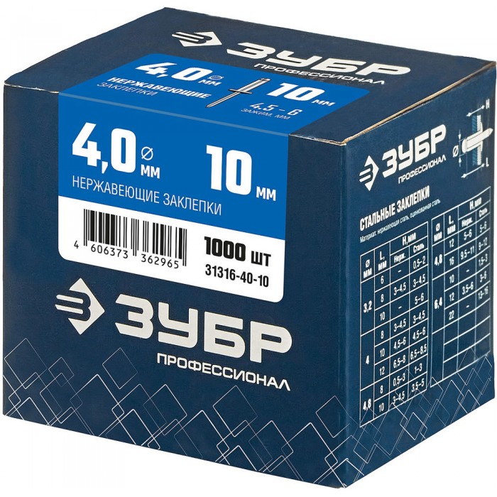 Заклёпки нержавеющие 4.0?10 мм 1000 шт ЗУБР Профессионал 31316-40-10