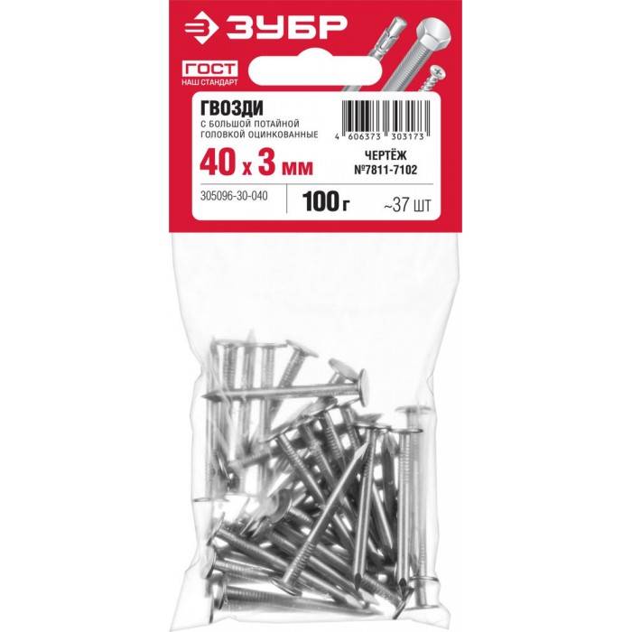 Гвозди 40?3 мм с большой потайной головкой цинк 100 г ЗУБР 305096-30-040
