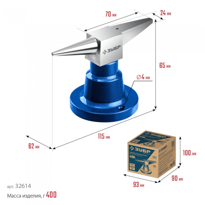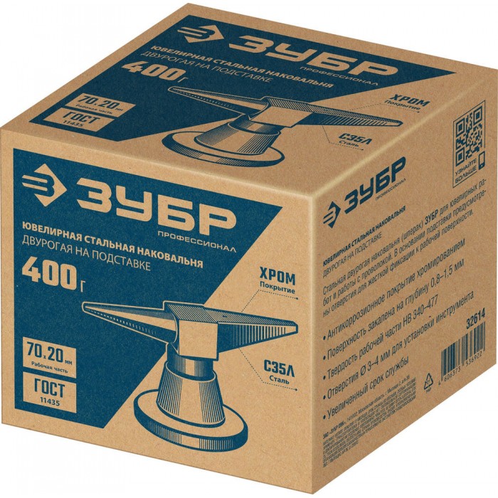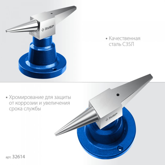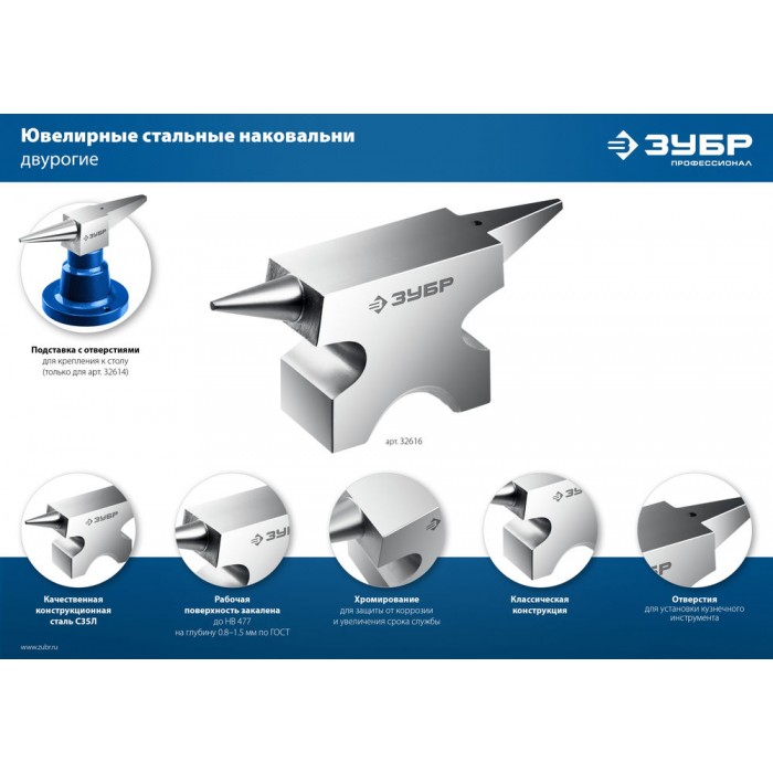 Стальная двурогая наковальня ЗУБР (шперак) для ювелирных работ и работы с проволокой . Антикоррозионное покрытие хромированием Сталь С35Л. Поверхность закалена на глубину 0,8-1,5 мм. Твердость рабочей части HB 340-477. Отверстия Ø3-4 мм для установки инструмента. Увеличенный срок службы. Для точных работ. Серия Профессионал У настольной версии предусмотрены отверстия для жеской фиксации на столе.