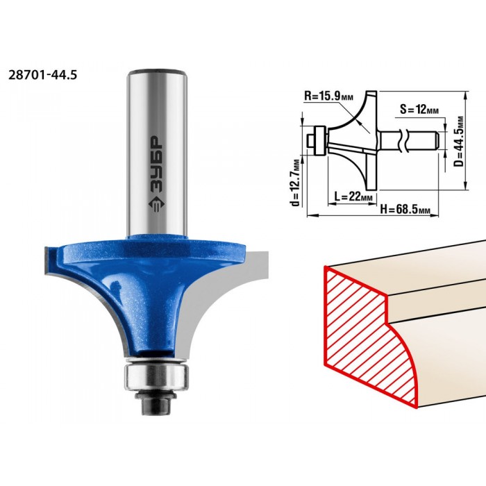 Фреза кромочная калевочная №1 44.5?22 мм радиус 16 мм ЗУБР Профессионал 28701-44.5