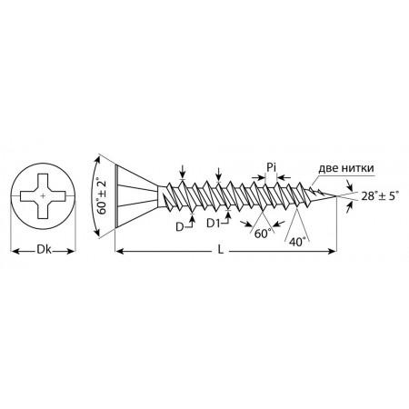 Саморезы для крепления гипсоволоконных листов (ГВЛ) изготовлены из стального прутка с высоким содержанием углерода. Контроль за геометрией самореза начинается с калибровки прутка и заканчивается тщательной проверкой размеров готового изделия. Нормативная твердость стали достигается термической обработкой. Поверхностная твердость 550-800HV, твердость в сердцевине 240-425HV. Саморезы легко вкручиваются обычным шуруповертом или отверткой с крестообразным шлицем PH2 (DIN). Предварительное сверление в скрепляемых материалах не требуется. Геометрические размеры: диаметр головки (Dk) - 6.9-7.3мм, диаметр высокой резьбы (D) - 4.05-4.25мм, диаметр низкой резьбы (D1) - 2.9-3.2мм, шаг резьбы (Pi) - 1.59мм.
