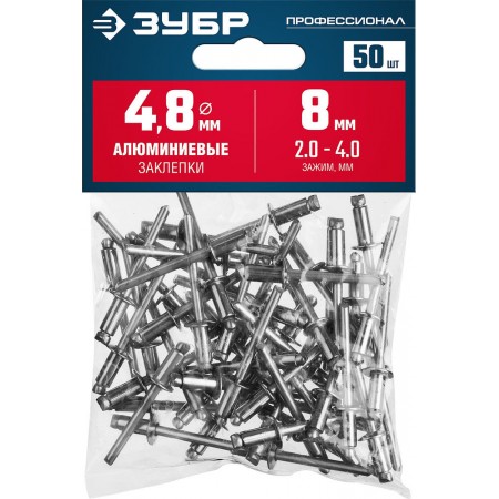Заклёпки алюминиевые 4.8?8 мм 50 шт ЗУБР Профессионал 313106-48-08