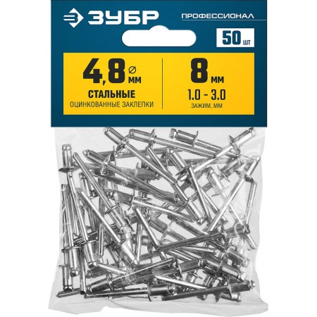 Заклёпки стальные 4.8?8 мм 50 шт ЗУБР Профессионал 313126-48-08