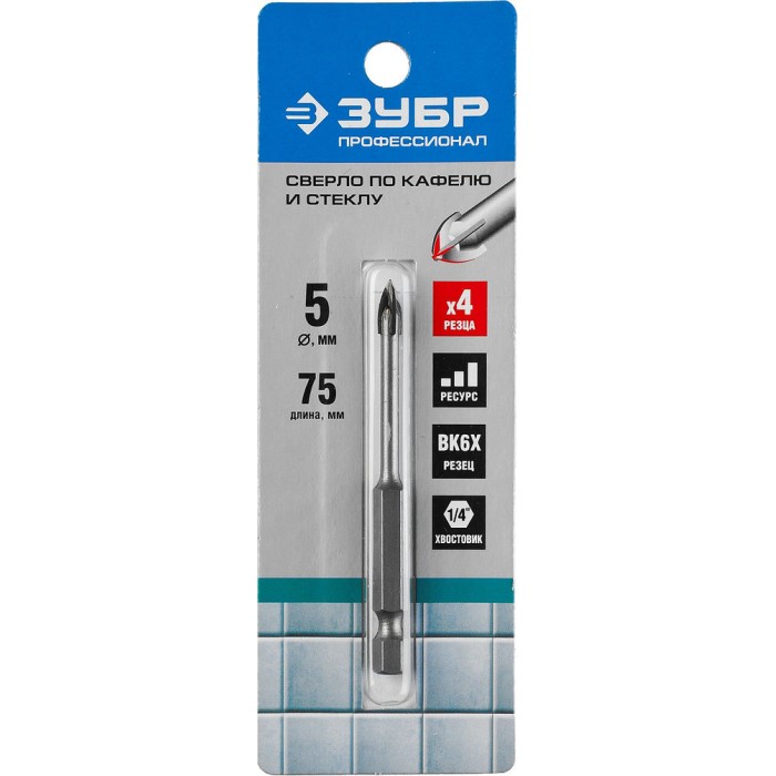 Сверло по стеклу и кафелю 5 мм, 4-х кромка, HEX 1/4 ЗУБР Профессионал 29845-05_z01