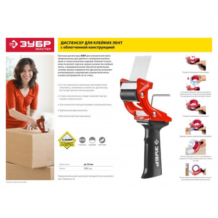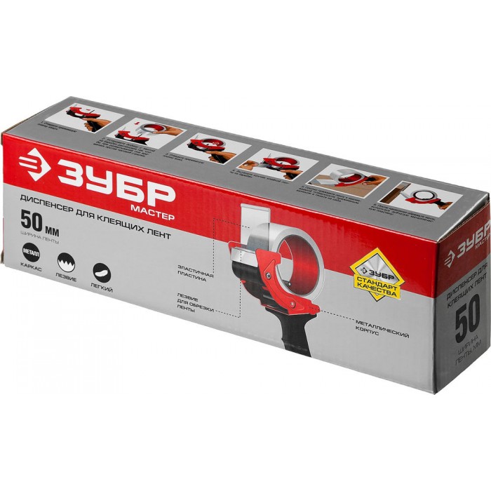 Обеспечивает удобство и комфорт при работе с клеящими лентами, облегчает и ускоряет работу. Снабжен металлическим лезвием для обрезки ленты, имеет удобную рукоятку и пластину для прижима отрезанной ленты. Оснащен металлическим каркасом, обеспечивающим высокую прочность изделия и длительный срок службы. Механический тормоз позволяет регулировать натяжение ленты.