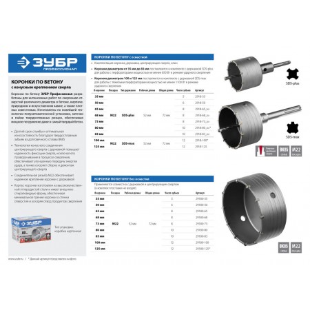 Предназначена для сверления отверстий в бетоне, кирпиче, природном и искусственном камне, а также плотных известняках. Используется с дрелями и перфораторами мощностью не менее 850 Вт в режиме ударного сверления.