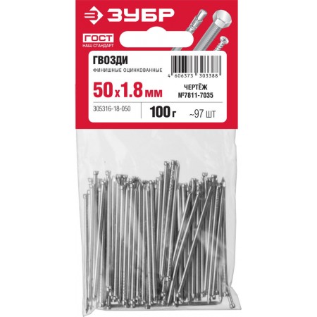 Гвозди финишные 50?1.8 мм цинк 100 г ЗУБР 305316-18-050
