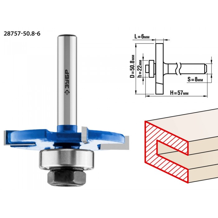 Фреза горизонтально-пазовая 50.8 x 6 мм, хвостовик 8 мм ЗУБР Профессионал 28757-50.8-6