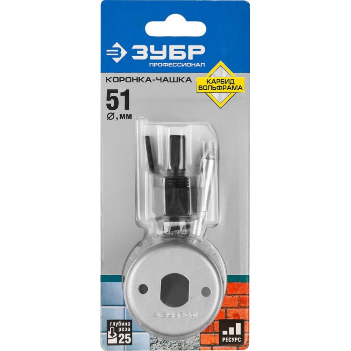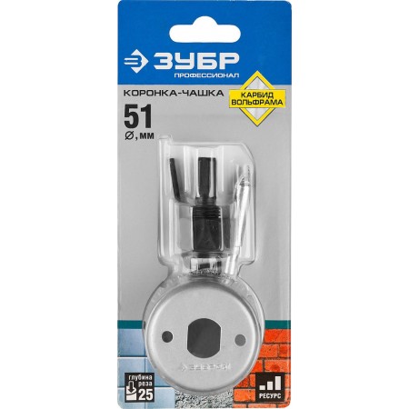 Коронка-чашка с державкой и сверлом 51 мм, L 25 мм, карбид вольфрама ЗУБР Профессионал 33360-051_z01
