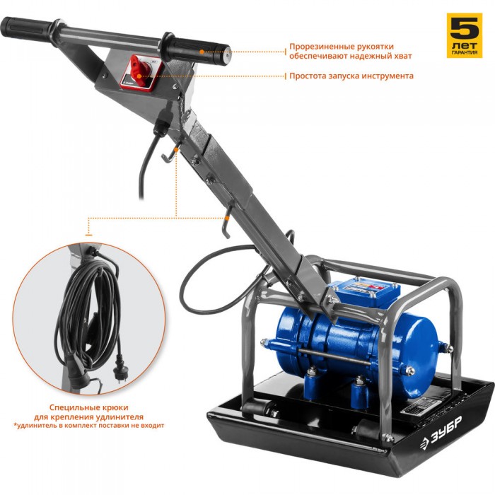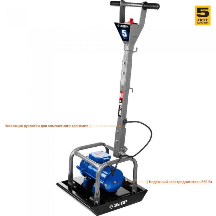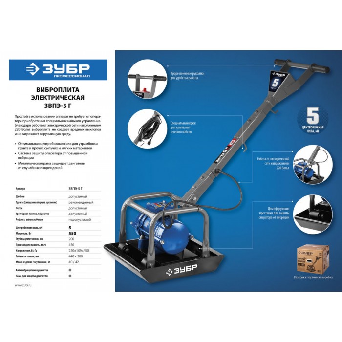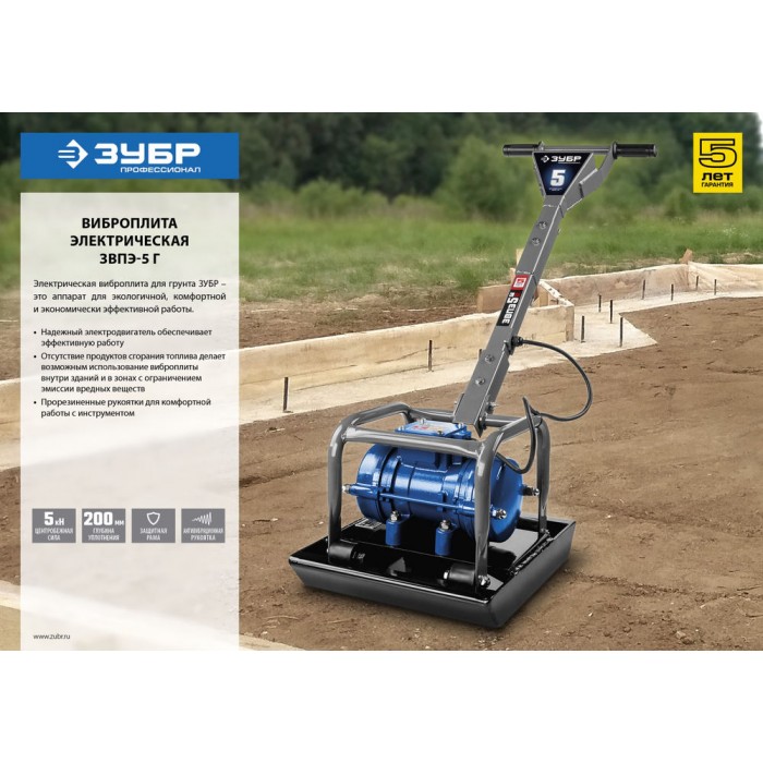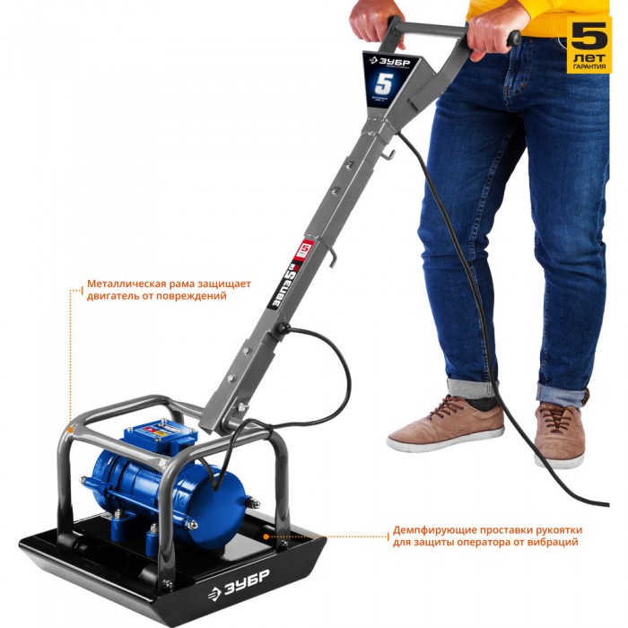 Электрическая виброплита ЗУБР проста в использовании и не требует от оператора приобретения специальных навыков для управления. Машина работает от электрической сети напряжением 220 В, поэтому не производит вредных выхлопов.