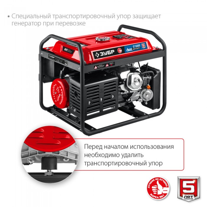 Мощный двухтопливный электрогенератор мощностью 5.5 кВт, работающих как на бензине (АИ-92), так и на газе – при этом, для использования газа не требуется установка дополнительного оборудования. Генератор этой модели используется в загородном доме, строительной площадке и дачном участке для питания бытовой техники, насосных станций и электронагревателей. Аккумуляторная батарея не входит в комплект поставки. Емкость батареи не менее 14 А*ч.