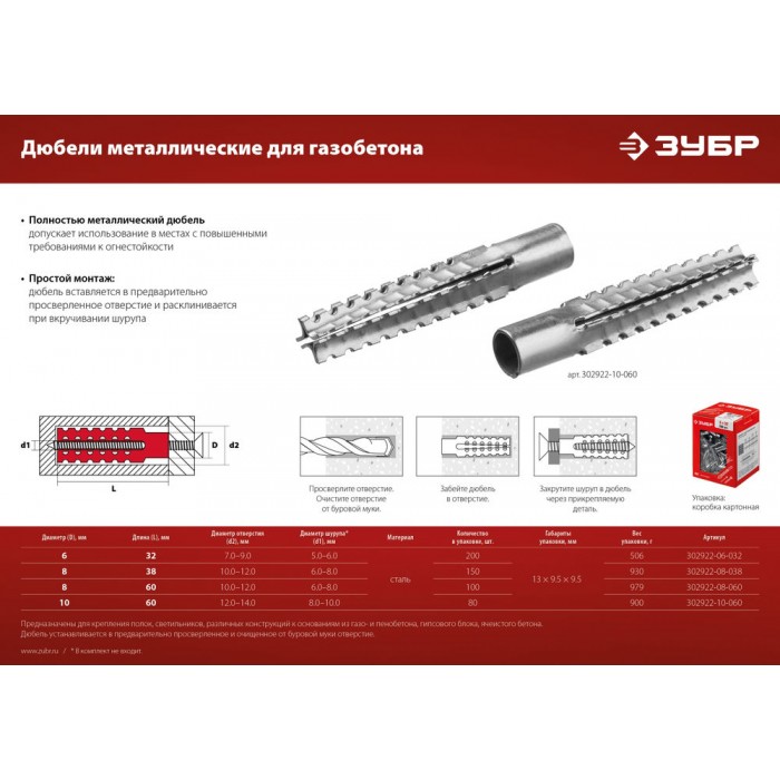 Дюбель металлический для газобетона 6 х 32 мм, 200 шт ЗУБР 302922-06-032