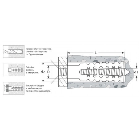 • Простота установки - дюбель вставляется в предварительно просверленное отверстие и расклинивается при вкручивании шурупа