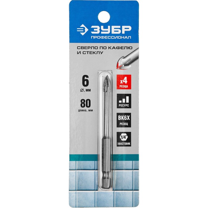 Сверло по стеклу и кафелю 6 мм, 4х кромка, HEX 1/4 ЗУБР Профессионал 29845-06_z01