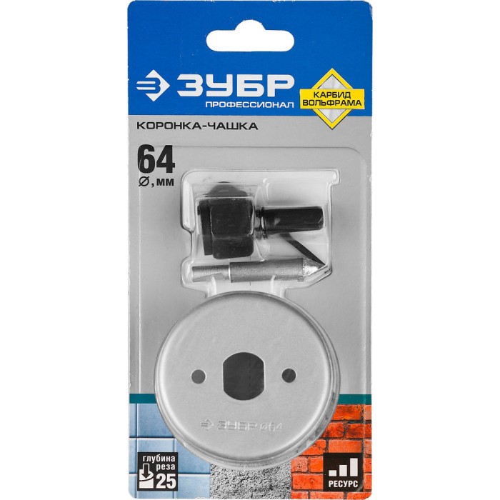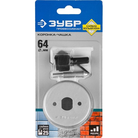 Коронка-чашка с державкой и сверлом 64 мм, L 25 мм, карбид вольфрама ЗУБР Профессионал 33360-064_z01