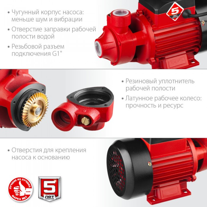 Высокие эксплуатационные свойства и простая конструкция - это то, что нужно для дачного участка. Чугунный корпус предохраняет внутренние детали от повреждения и обеспечивает долгий срок службы. Благодаря компактной конструкции насос легко установить даже в ограниченном пространстве, а крепления-ножки способствуют устойчивости. При помощи этого насоса вы без труда решите проблему водоснабжения и полива растений на участке