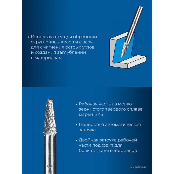Борфреза твердосплавная 6?16 мм тип L конус с закругленным углом 28° радиус 1.2 мм хв-к 6 мм Профессионал ЗУБР 28810-6-16