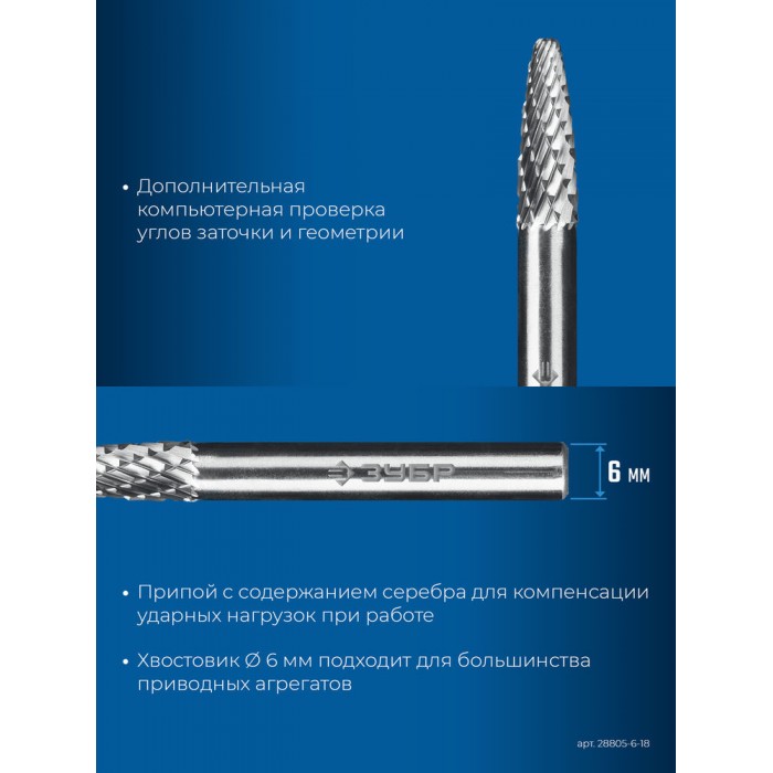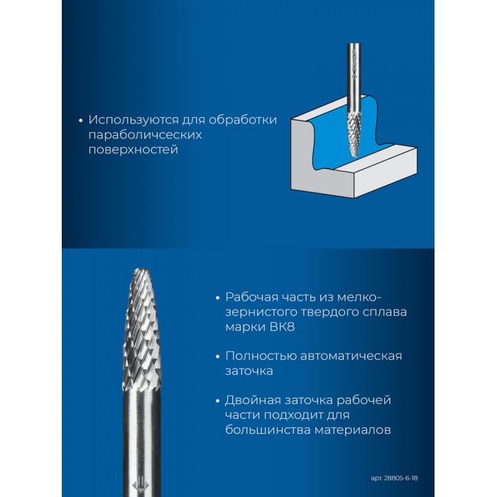 Борфреза твердосплавная 6?18 мм тип F парабола с закругленным углом радиус 1.5 мм хв-к 6 мм Профессионал ЗУБР 28805-6-18