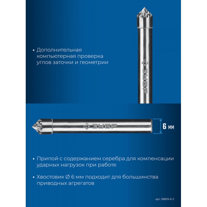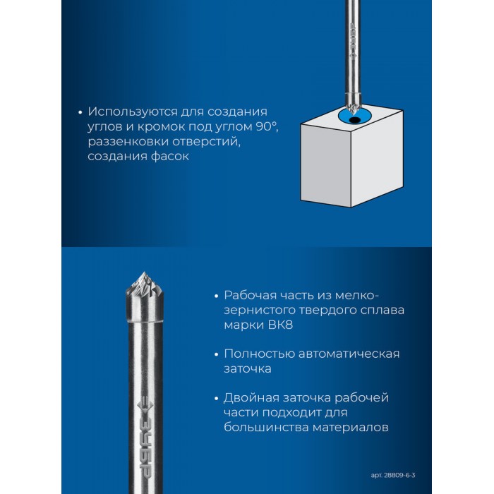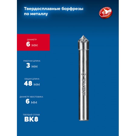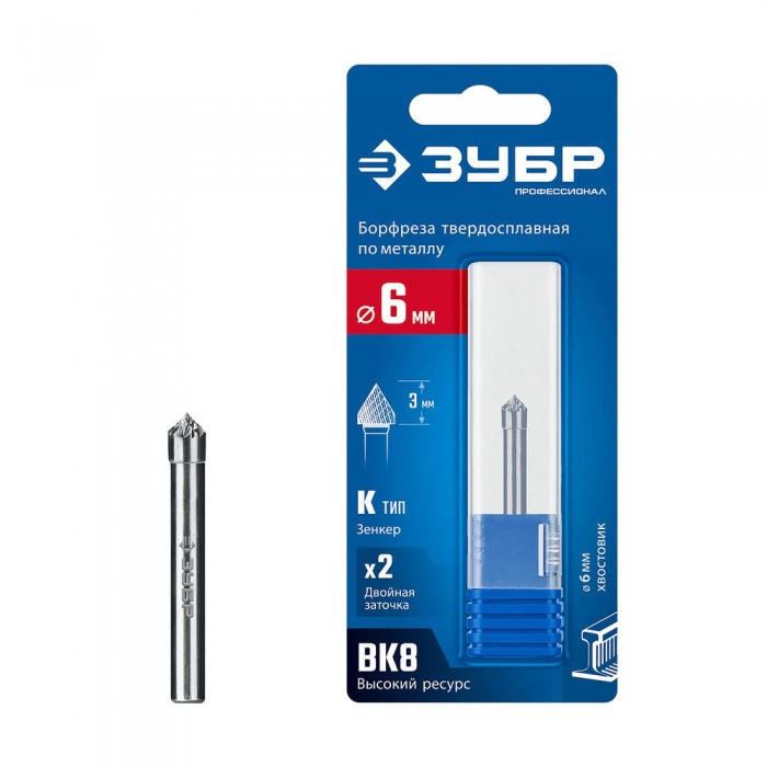 Борфреза твердосплавная 6?3 мм тип K зенкер с вершиной 90° хв-к 6 мм Профессионал ЗУБР 28809-6-3
